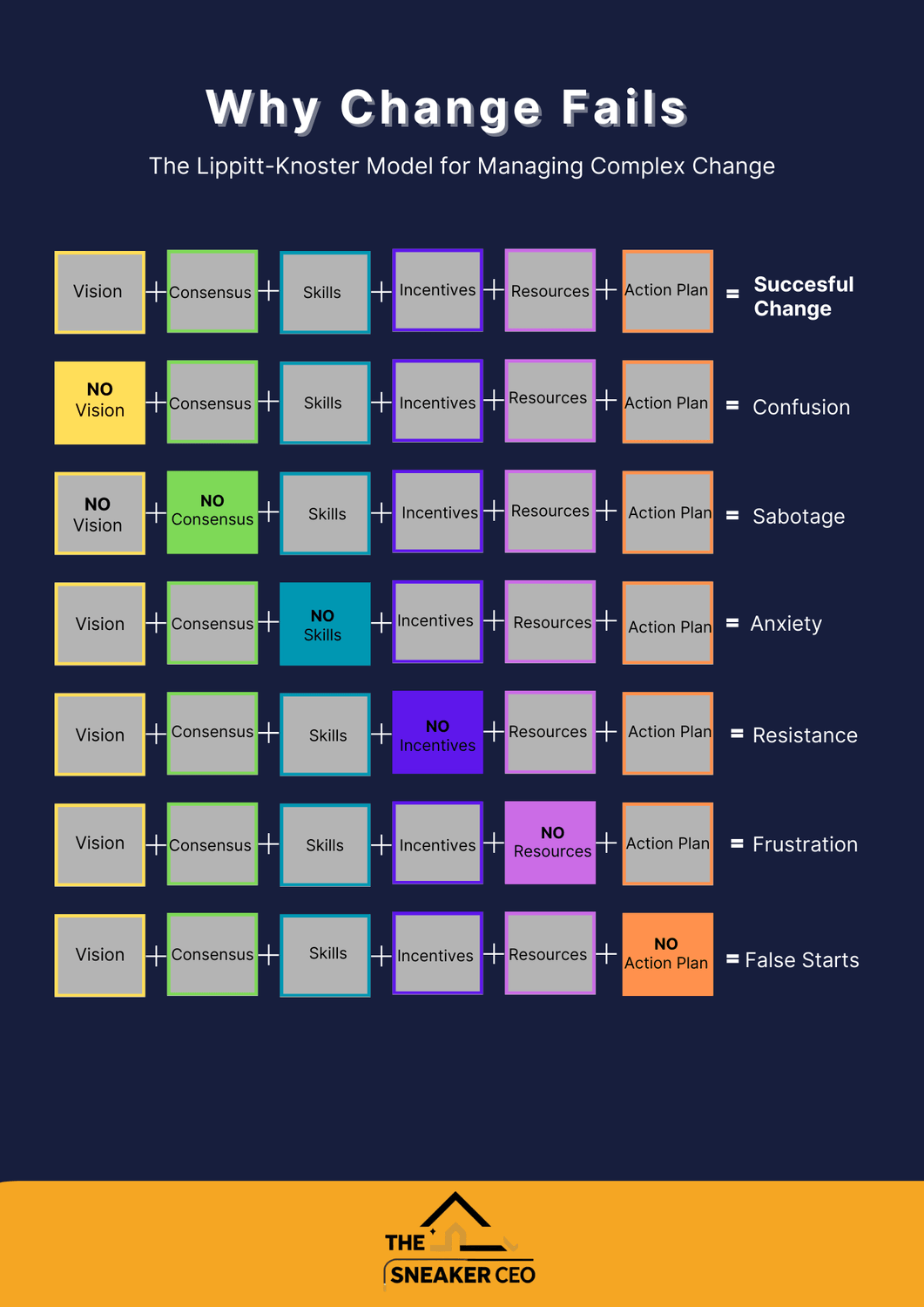 A framework that explains why change efforts break down and how to manage complex transitions successfully.